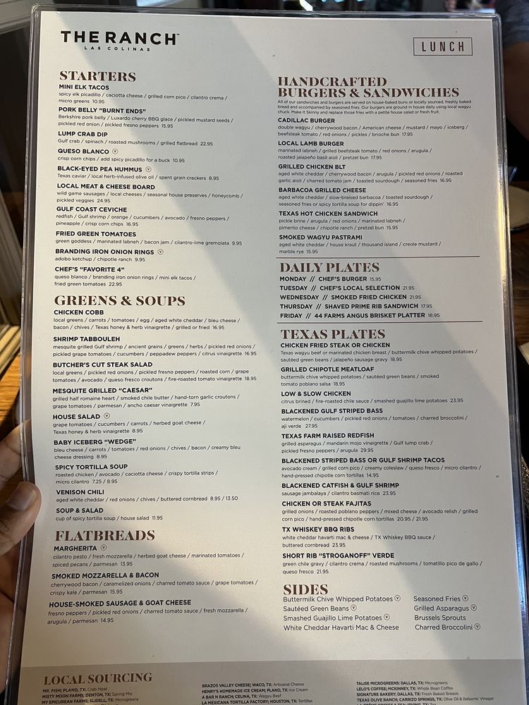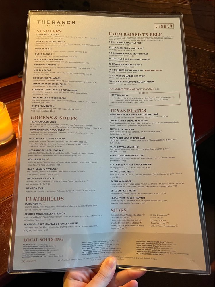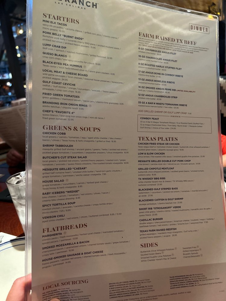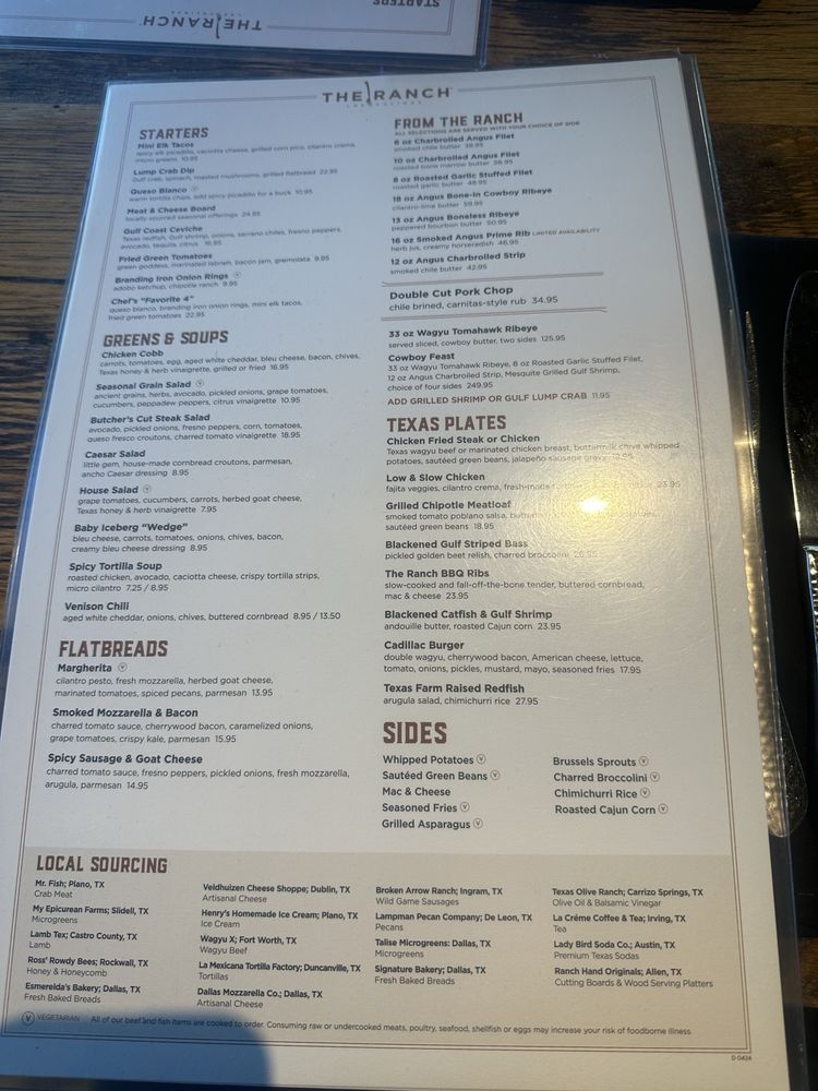 The Ranch is a well-known steakhouse located in Irving, Texas, offering a wide range of options for every type of diner. With a casual yet classy atmosphere, this restaurant provides an array of utility options, including takeout, keto and vegan menu items, and even private dining options. Customers rave about the attentive waitstaff, delicious appetizers, and main dishes like the Boneless Cowboy Ribeye and Cowboy's Feast. The diverse menu also includes must-try items like the crab dip, country fried steak, and Whiskey Bread Pudding, all served with flavorful sides like loaded mashed potatoes and asparagus. The restaurant's ambiance is highlighted by cowboy-themed decor, expansive seating, and even live music. Whether you're looking for a fancy dinner or a family meal, The Ranch is the perfect spot for any occasion. Don't miss out on the Happy Hour specials and extensive drink selection, making this restaurant a must-visit in the Las Colinas area.